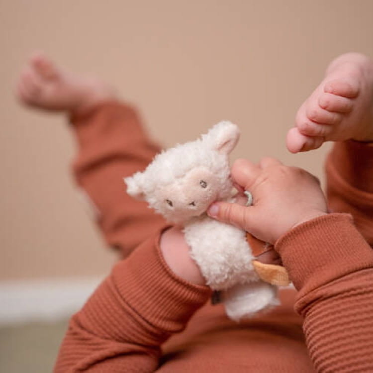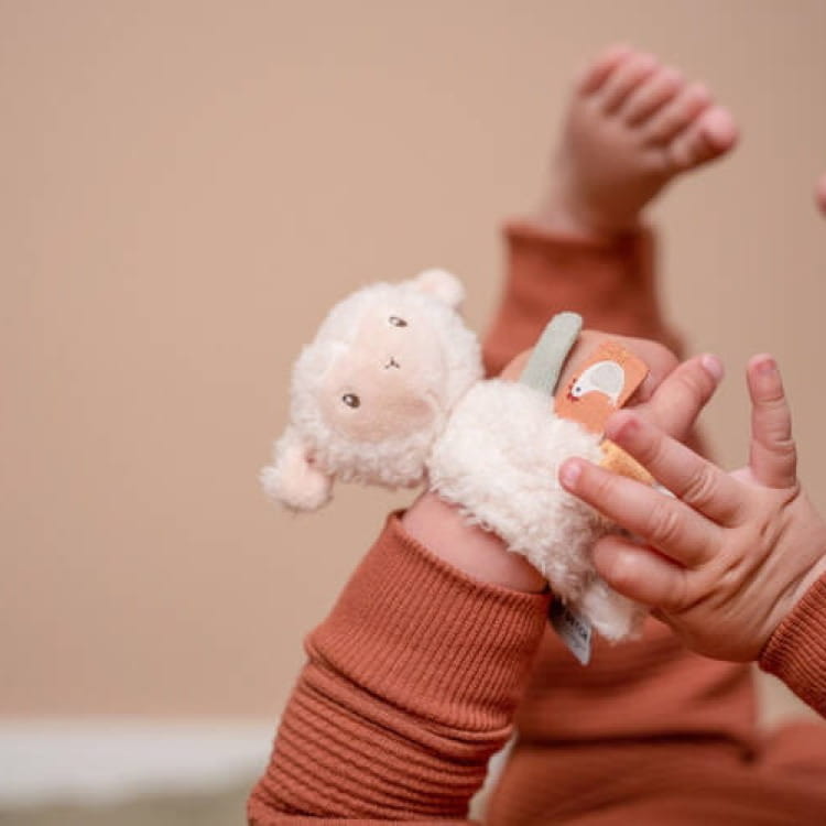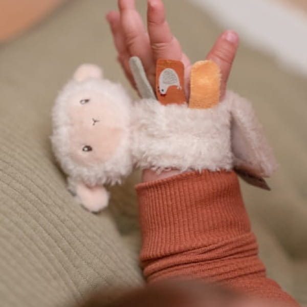 Na bransoletce znajduje się słodka pluszowa owieczka, która grzechocze przy poruszaniu, a dodatkowo – metki sensoryczne, które zachęcają do chwytania i ćwiczenia paluszków. Bransoletka Little Dutch jest lekka, miękka i bezpieczna, dzięki czemu może stać się pierwszą i ulubioną zabawką każdego niemowlęcia. Pomaga rozwijać koordynację ręka-oko, zdolności motoryczne i zmysł dotyku.