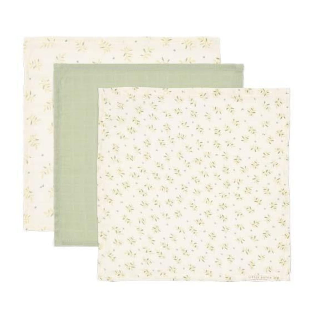 Zestaw łączy wzór Blueberry Leaves z jednolitym kolorem Sage — spokojna, pastelowa kolorystyka charakterystyczna dla Little Dutch. Mały rozmiar 25 x 25 cm sprawia, że zawsze masz je pod ręką w torbie, kieszeni czy przy przewijaku.