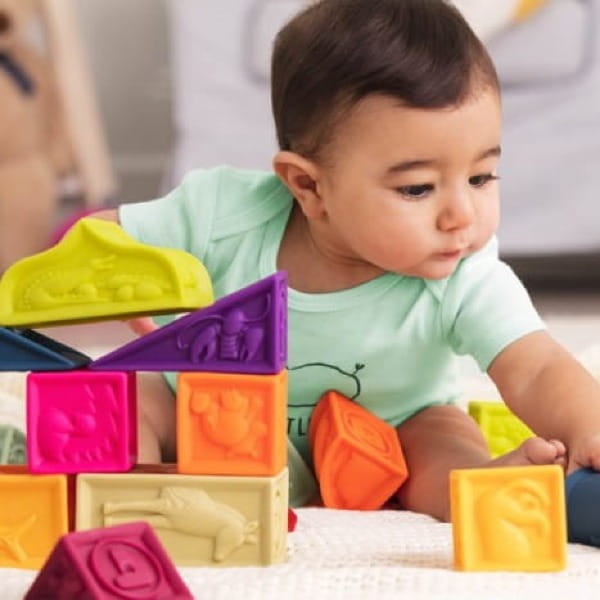 Dzięki różnorodnym kształtom, wypukłościom i literkom alfabetu, klocki zachęcają malucha do eksploracji i ćwiczą jego małe rączki. Każdy klocek przedstawia jedną literę oraz zwierzątko, którego angielska nazwa zaczyna się na daną literę.