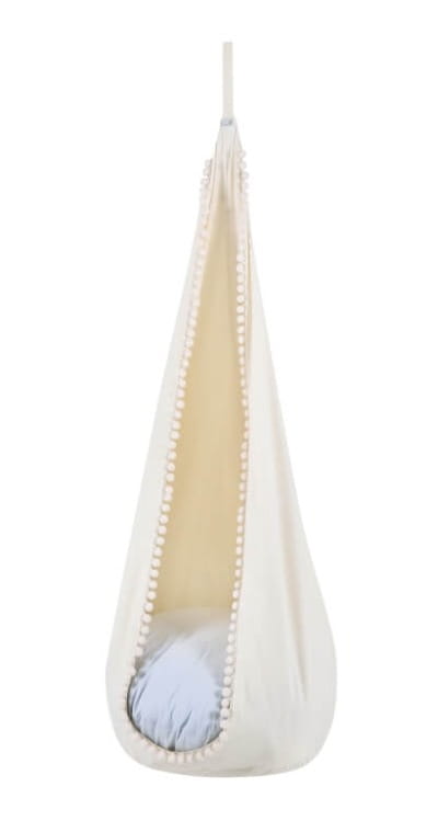 Estetyczne wykonanie i użycie wysokiej jakości tkanin sprawia, że huśtawka jest miła w dotyku, a wzmocniony, solidny uchwyt górny zapewnia bezpieczeństwo użytkowania (wytrzymuje do 80 kg obciążenia). Wewnątrz kokonu znajduje się okrągłe, wygodne siedzisko - poduszka w poszewce zapinanej na zamek, dzięki czemu łatwiej ją ściągnąć do prania.