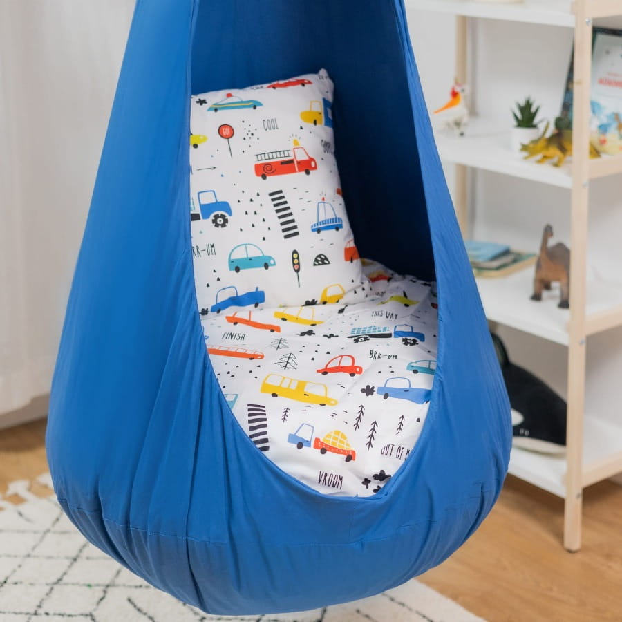 Huśtawka Kokon dla Dzieci "Kierowca Marzeń" to przytulne, wiszące siedzisko, które otula malucha, zapewniając mu bezpieczne miejsce do zabawy, relaksu i snu.