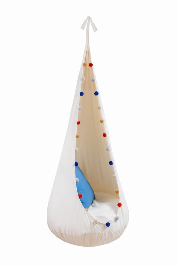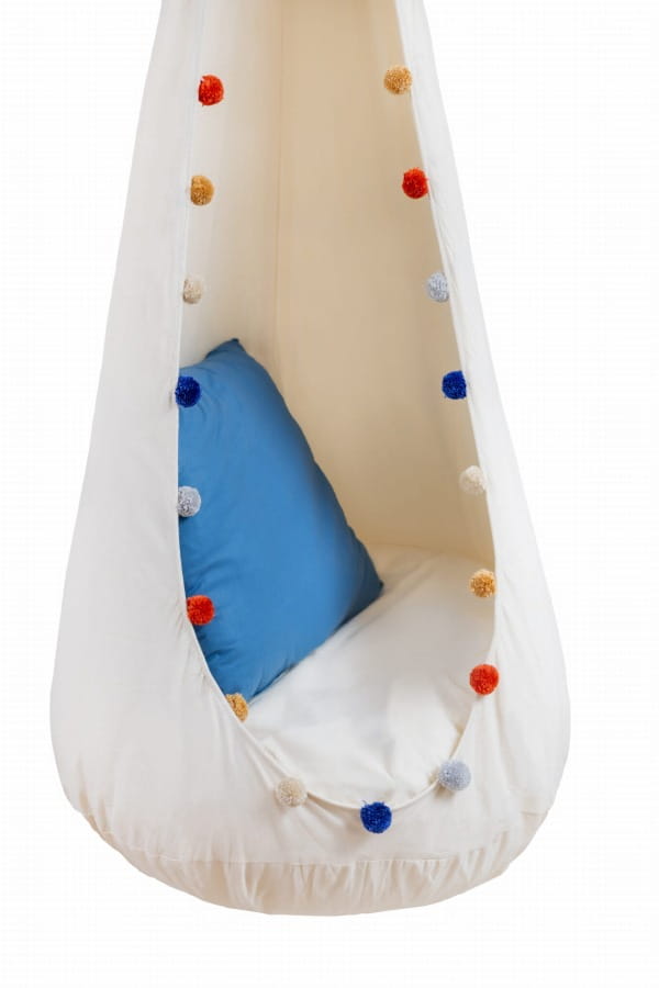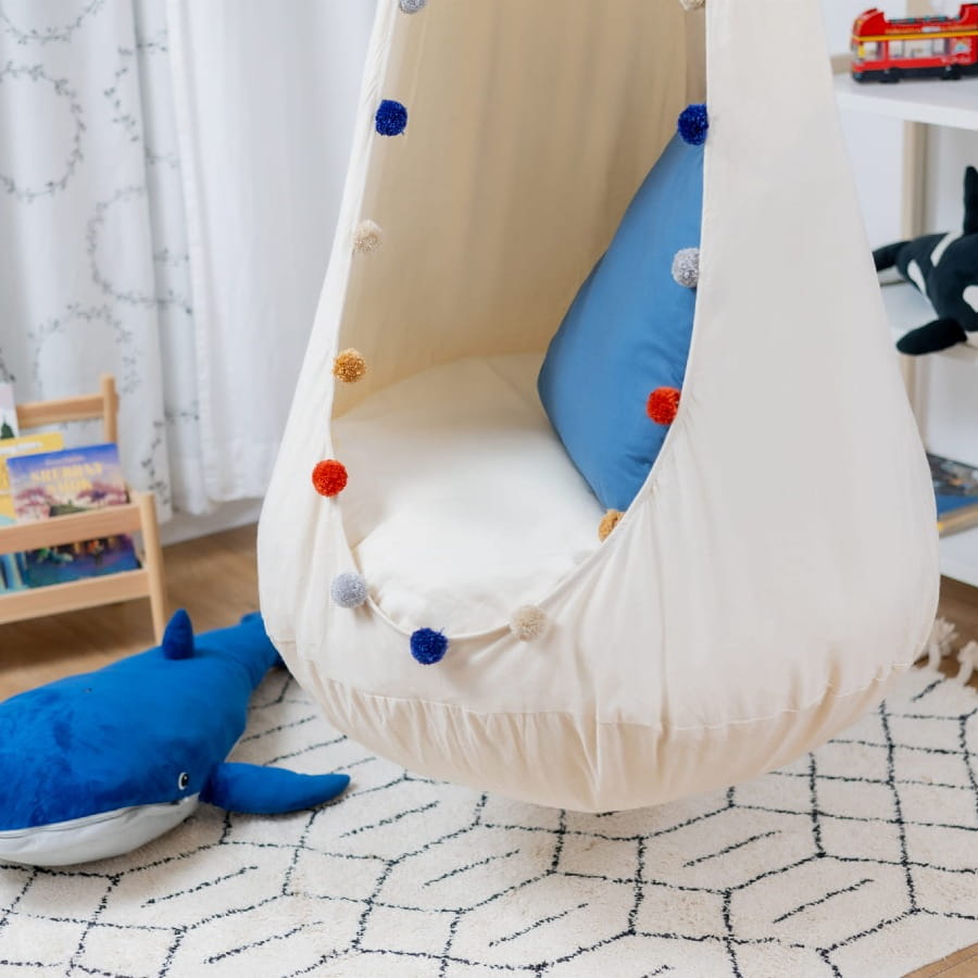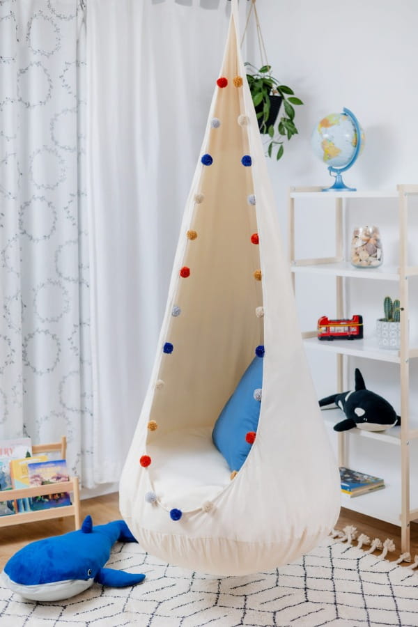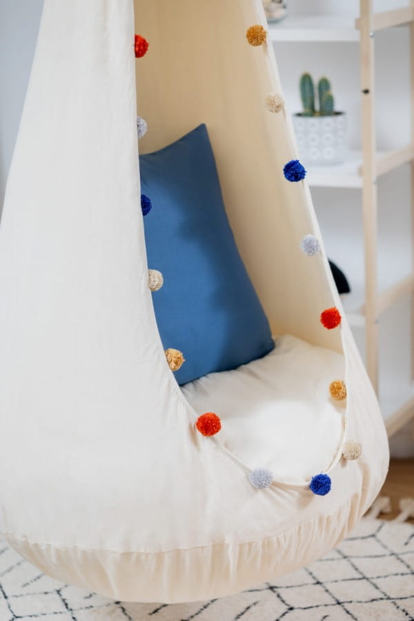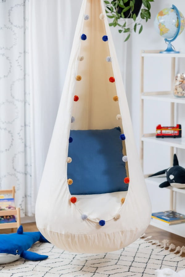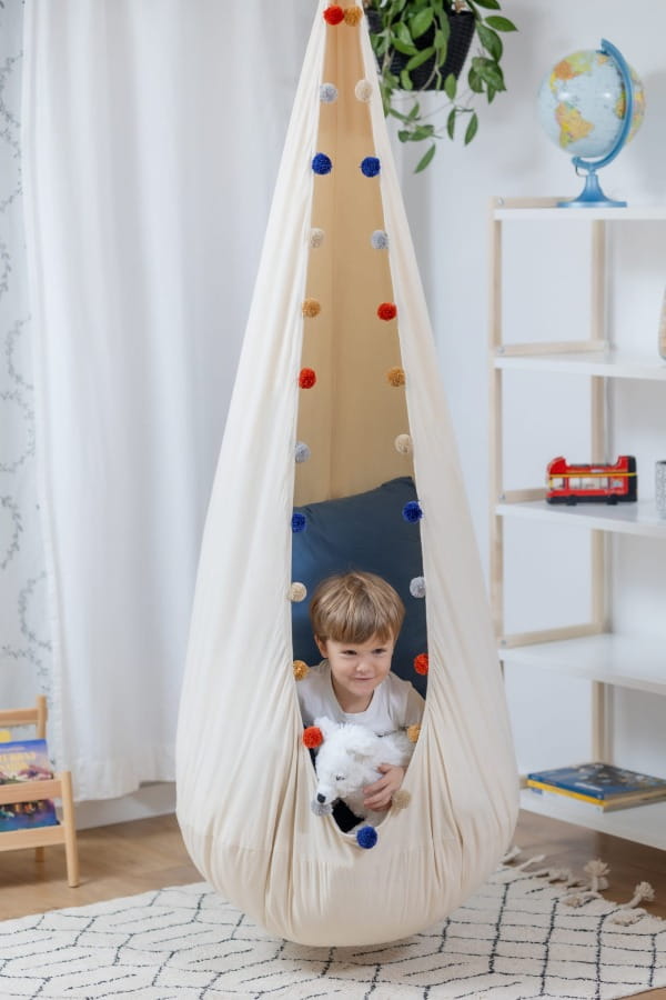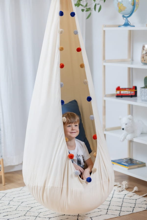 Huśtawka Kokon dla Dzieci "Wesoły Pomponik" to przytulne, wiszące siedzisko, które otula malucha, zapewniając mu bezpieczne miejsce do zabawy, relaksu i snu.