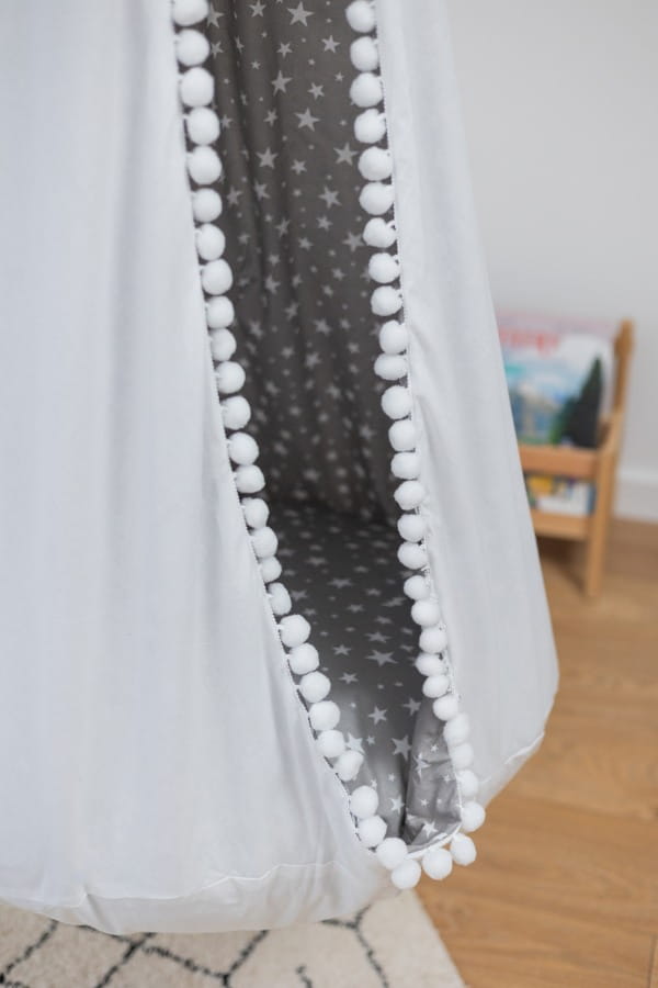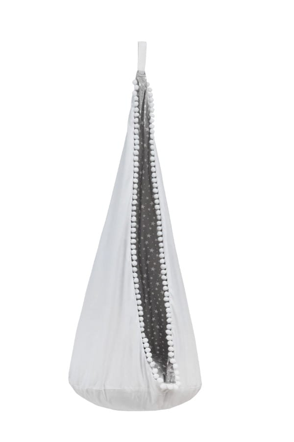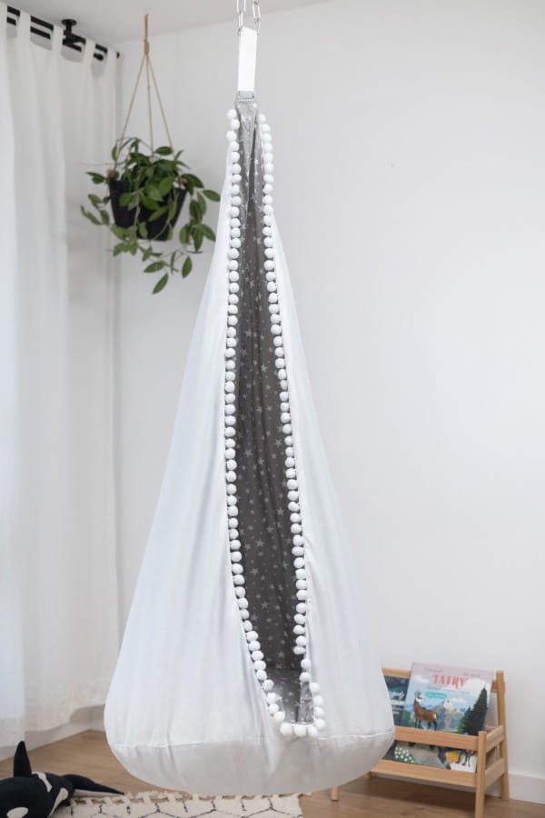 Huśtawka Kokon dla Dzieci "Mała Gwiazdeczka" to przytulne, wiszące siedzisko, które otula malucha, zapewniając mu bezpieczne miejsce do zabawy, relaksu i snu.