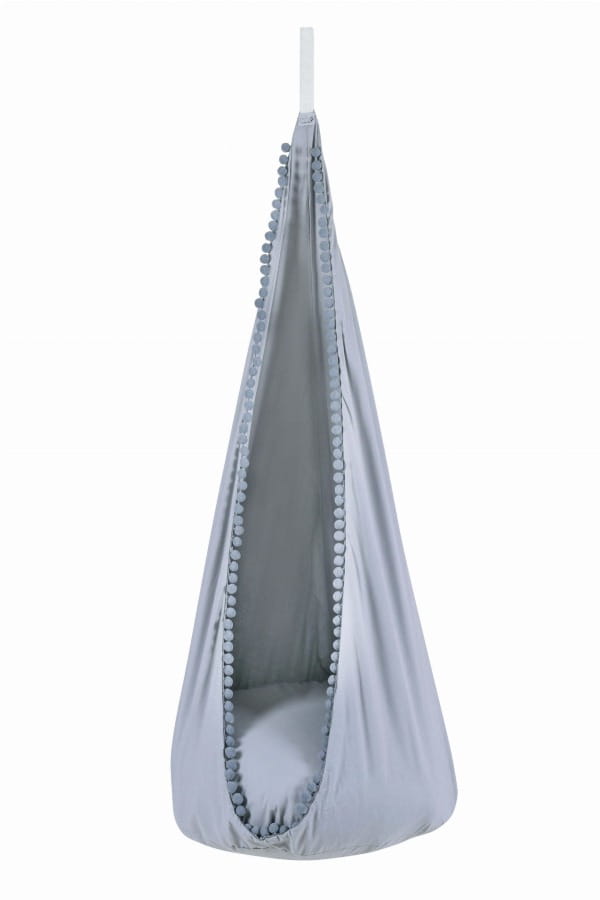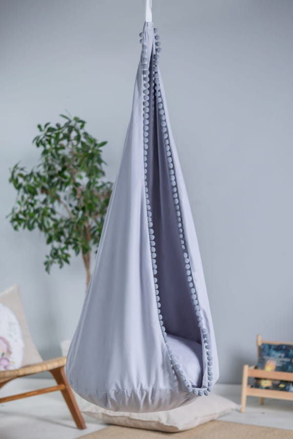 „Trąbulski” to fantastyczna huśtawka w szarym kolorze, udekorowana małymi pomponikami. Uniwersalny modny kolor pasować będzie do każdego wnętrza.