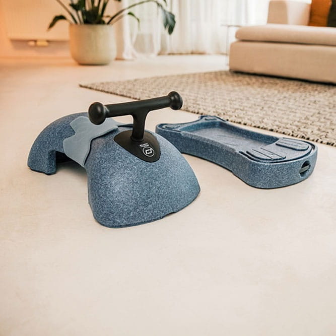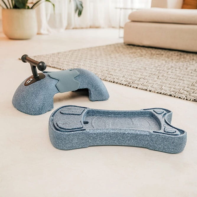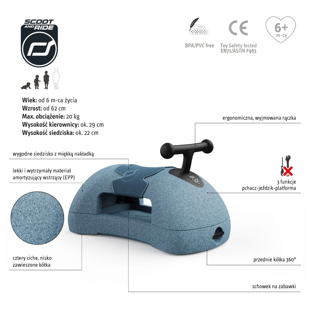 Jeździk został wykonany z niezwykłego materiału – EPP (spienionego polipropylenu), który ze względu na swoje unikatowe właściwości, używany jest m.in. we wnętrzach ochronnych kasków (np. rowerowych) czy do produkcji fotelików samochodowych. Jest to lekkie, a przy tym niezwykle wytrzymałe tworzywo, odporne na działanie czynników zewnętrznych – nie tylko wody czy zmiany temperatury, ale nawet czynników mechanicznych, jak uderzenia. Materiał ten świetnie znosi duże przeciążenia i doskonale amortyzuje wstrząsy, a jednocześnie jest „przyjazny” dla otoczenia - podłogi, ścian czy mebli (przy zderzeniu nie powoduje rys, zagnieceń etc.) i nadaje się do recyklingu.