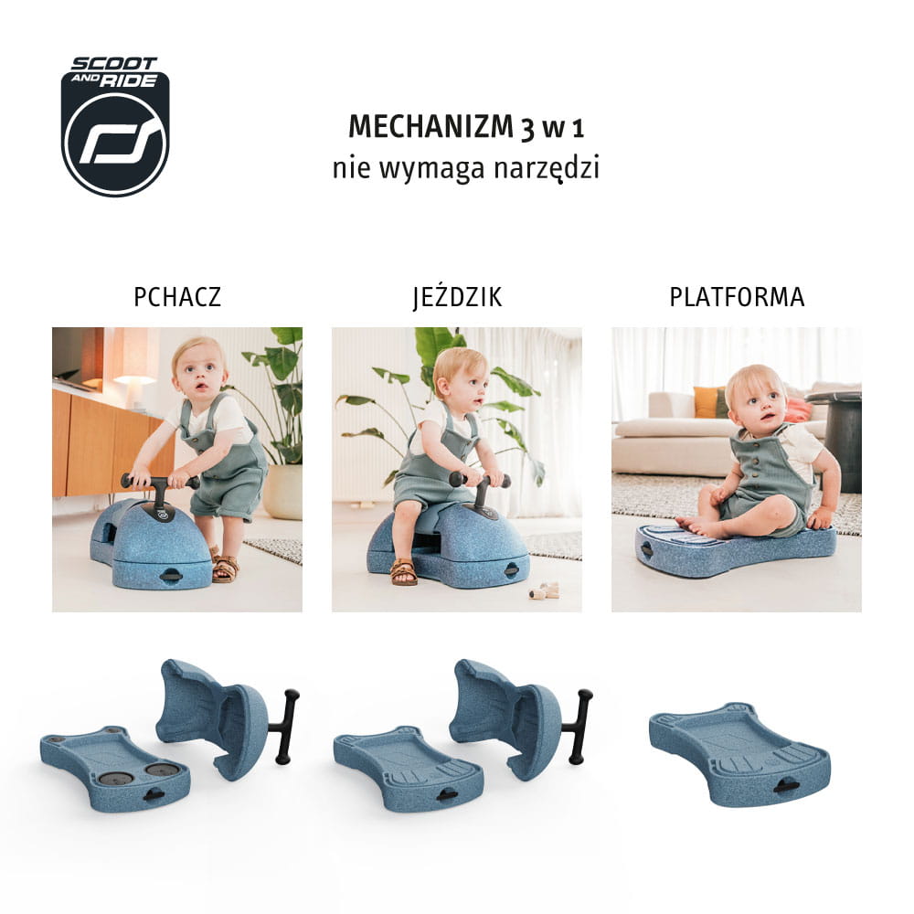- funkcje 3w1: pchacz, jeździk i deska na kółkach