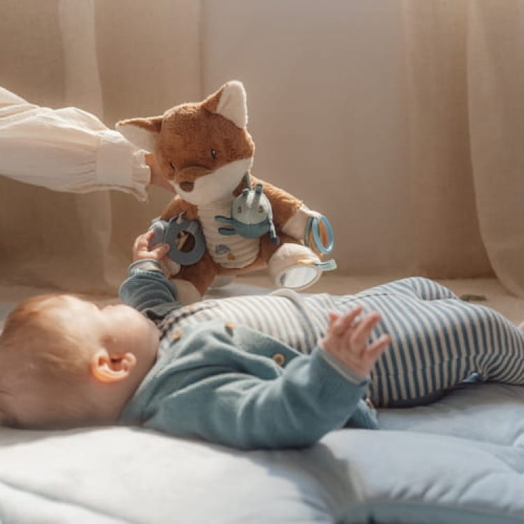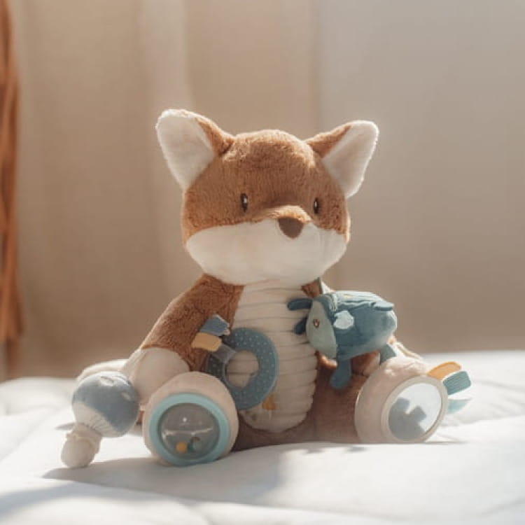 Lisek ma szeleszczącego żuczka na ramieniu, grzechotkę, grzybek i metki do chwytania, a także lustereczko i kółka – wszystko, co pobudza ciekawość i dostarcza mnóstwa radości. Po zakończonej zabawie miękki lisek staje się doskonałym towarzyszem do przytulania i snu, przenosząc dziecko w świat zaczarowanego lasu.