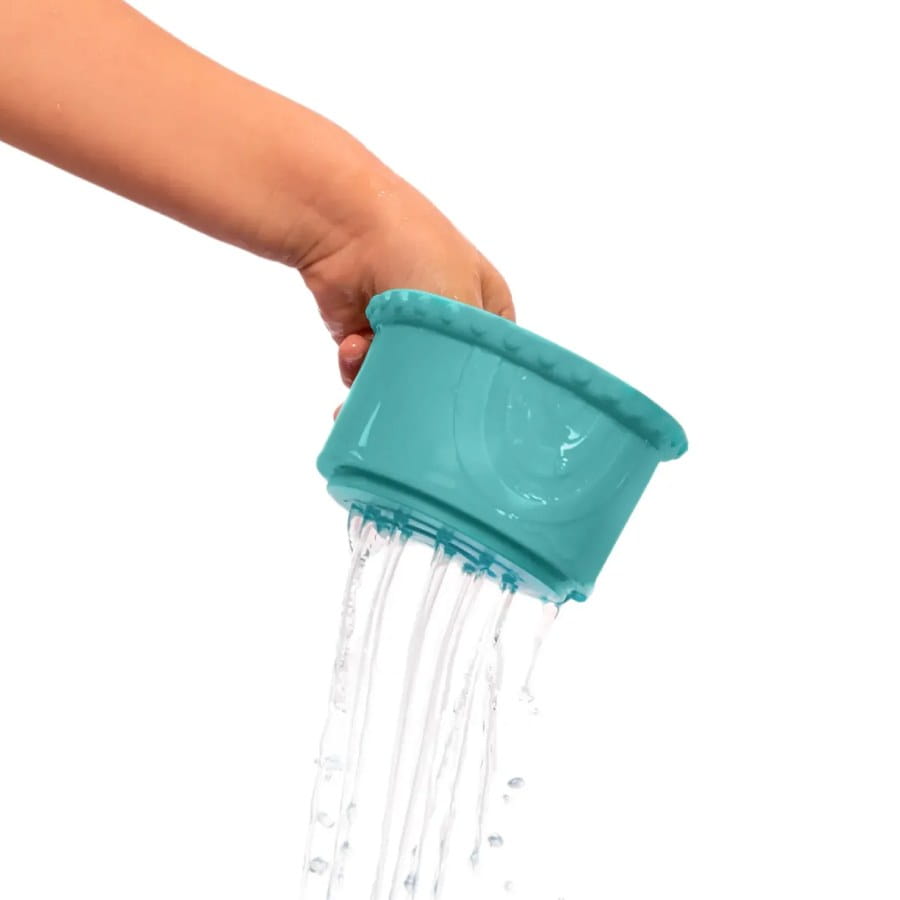 - 7 elastycznych kubeczków do budowania wież lub wkładania jeden w drugi – większość z otworami w dnie, idealnymi do zabawy w kąpieli.