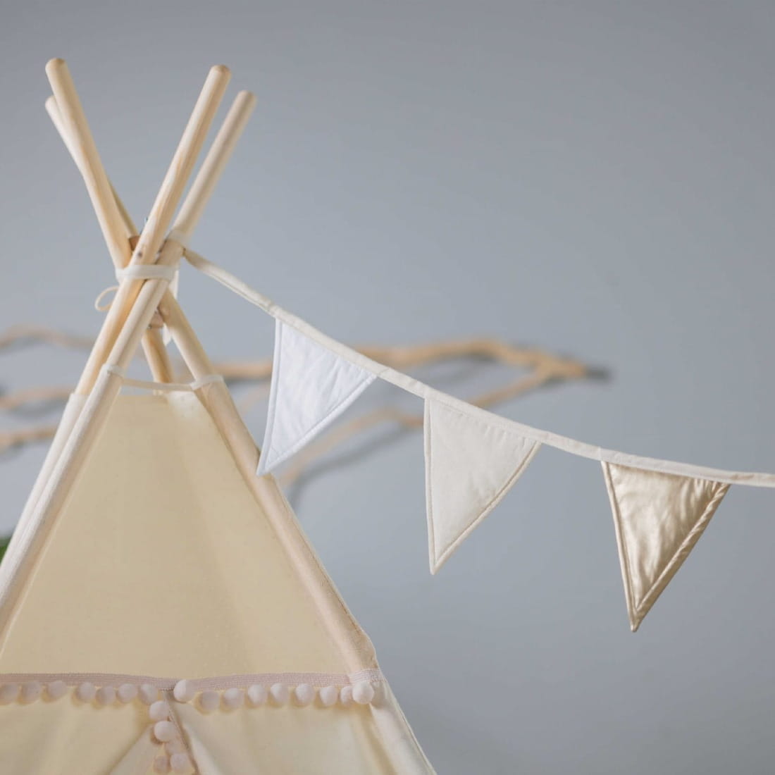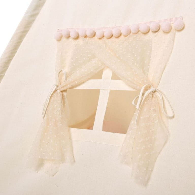 Tipi "Kuleczkowa Mgiełka" to idealny namiot dla małych marzycieli. Zwiewny, delikatny, w stonowanej ciepłej kolorystyce. Udekorowany małymi pomponikami i lekką siateczką na górze. Wejdźcie do środka, a "Kuleczkowa Mgiełka" przeniesie Was do świata wyobraźni. Neutralne barwy sprawią, że pasować będzie do każdego pokoju dziecięcego. Całość uszyta z wysokiej jakości tkanin z certyfikatem bezpieczny dla dziecka (bawełna i surówka naturalna bawełniana z charakterystyczną strukturą, 100% ekologiczna, bezpieczna, niebarwiona, w naturalnym kolorze ecru).