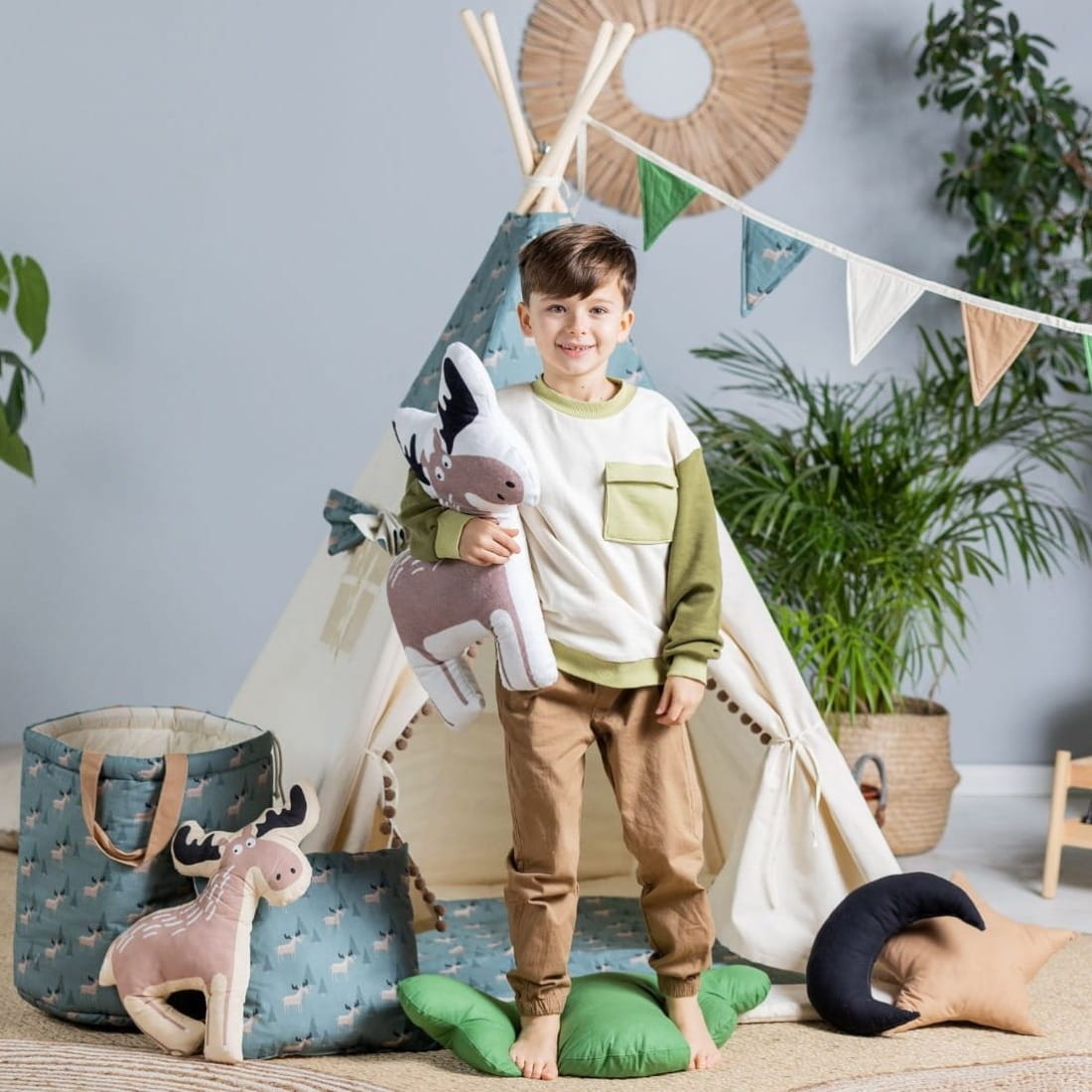 Namiot tipi Łosie to propozycja dla miłośników lasu i jego mieszkańców. Cała kompozycja utrzymana jest w beżach, brązach i zieleni. Urocze rysunki łosi i małe pomponiki z pewnością podbiją Wasze serca.