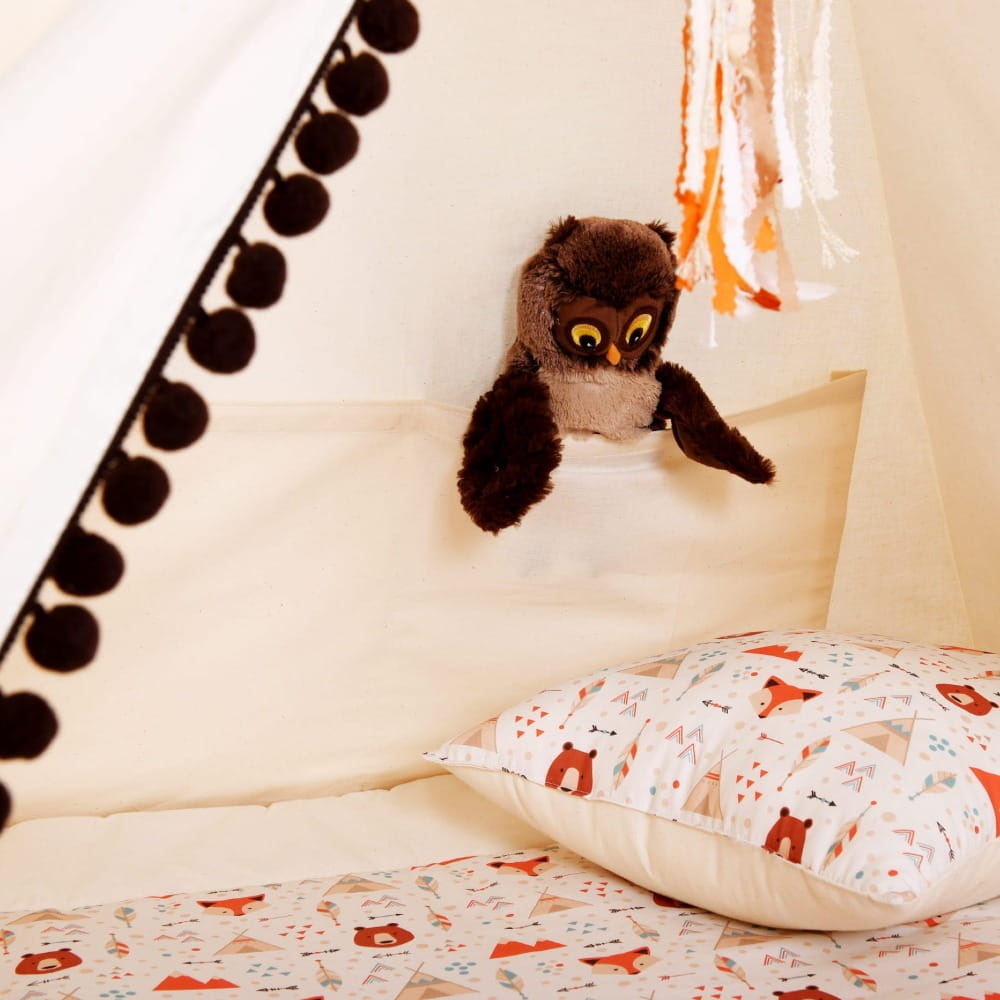 Namiot "Mój Przyjaciel Miś" to urocze tipi dla chłopca i dla dziewczynki. Całość skomponowana jest w delikatnej kolorystyce, dzięki czemu pasować będzie do każdego wnętrza. Głównym elementem dekoracyjnym jest motyw zwierzątek leśnych, co z pewnością przypadnie do gustu małym miłośnikom zwierząt. Całość uszyta z wysokiej jakości tkanin z certyfikatem bezpieczny dla dziecka (bawełna i surówka naturalna bawełniana z charakterystyczną strukturą, 100% ekologiczna, bezpieczna, niebarwiona, w naturalnym kolorze ecru).