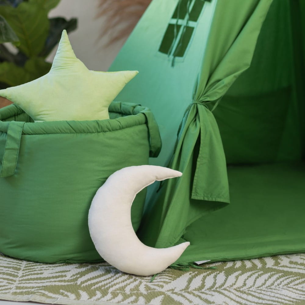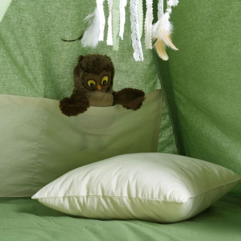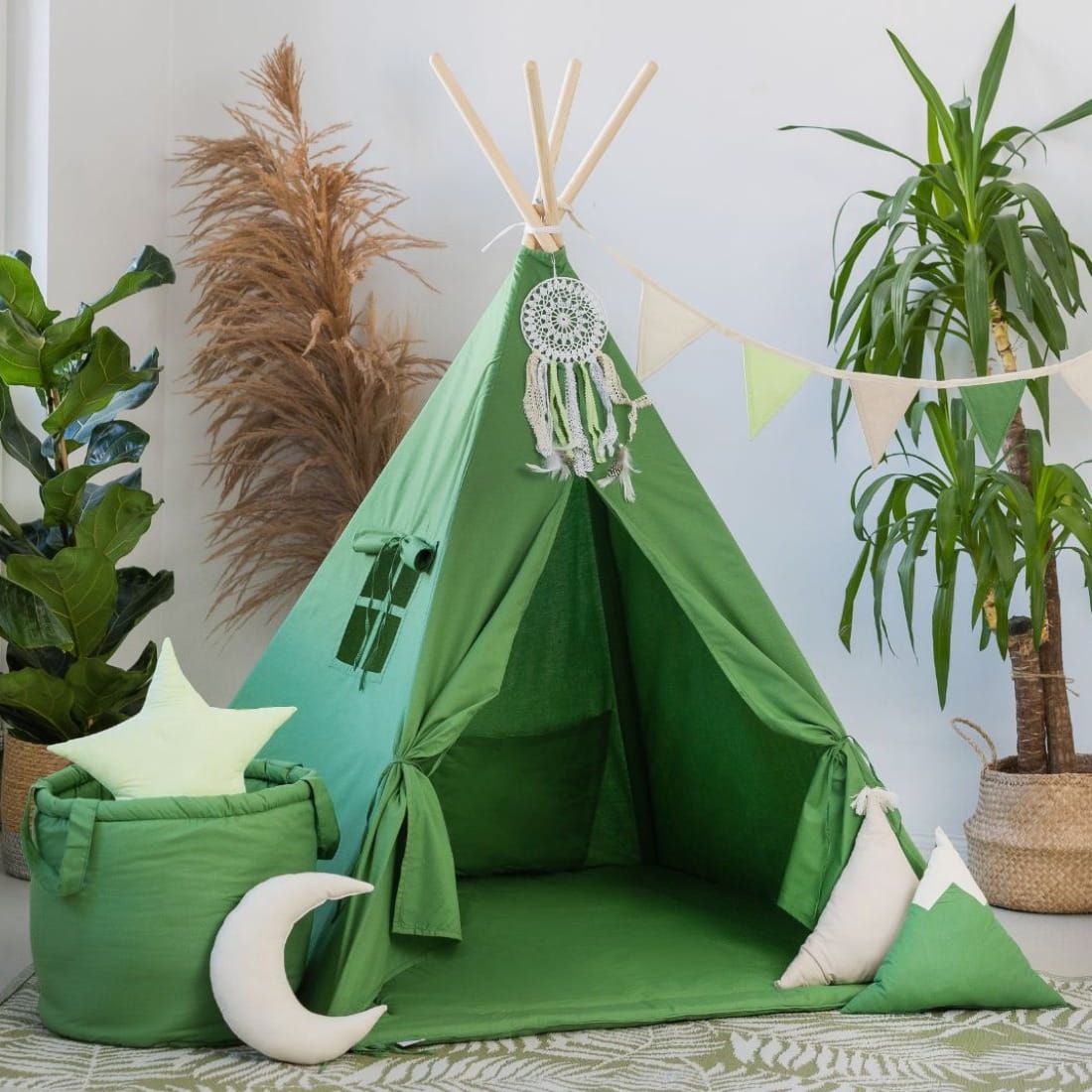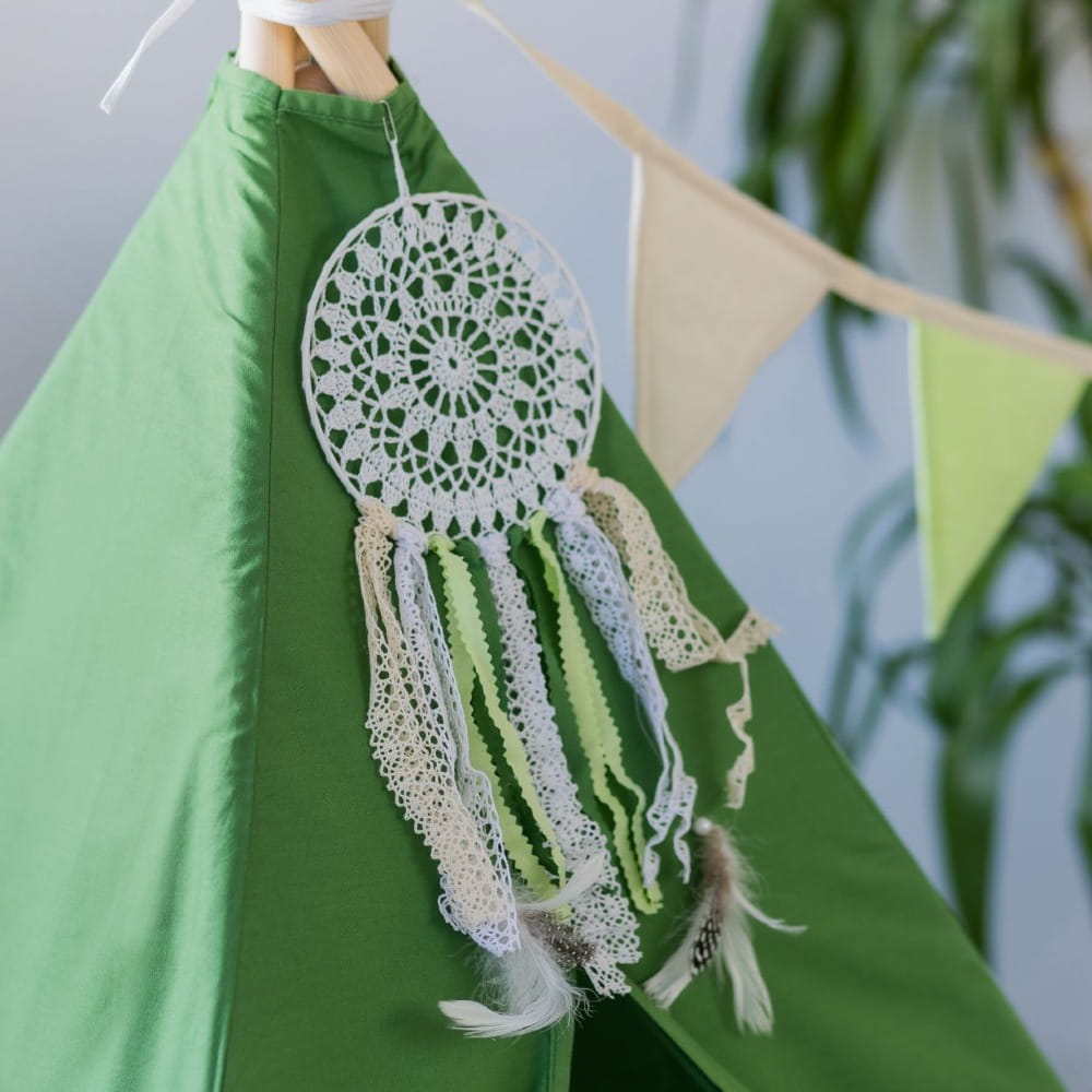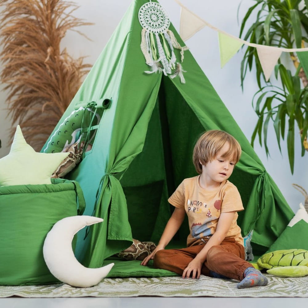 Namiot tipi "Zielono mi" to model nawiązujący do natury i spokoju. Stonowane barwy sprzyjają wyciszeniu i harmonii. Sprawdzi się jako doskonały prezent zarówno dla chłopca, jak i dla dziewczynki. Będzie idealnym dodatkiem do pokoju w leśnym klimacie. Całość uszyta z wysokiej jakości tkanin z certyfikatem bezpieczny dla dziecka (bawełna i surówka naturalna bawełniana z charakterystyczną strukturą, 100% ekologiczna, bezpieczna, niebarwiona, w naturalnym kolorze ecru).