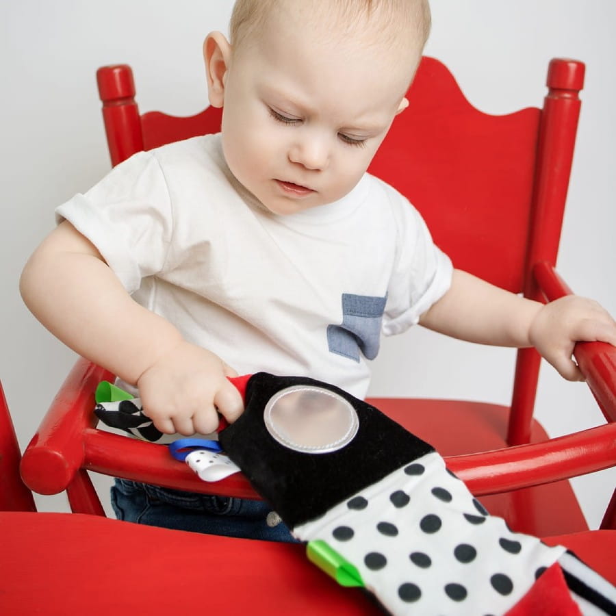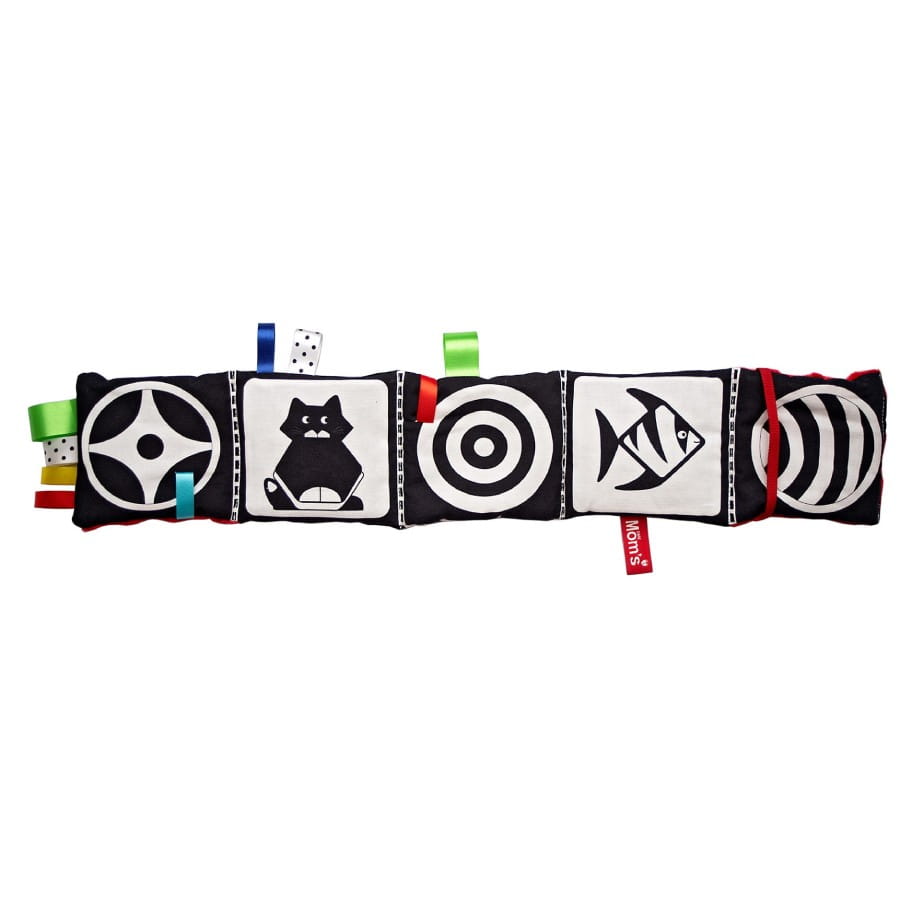 - Stymuluje zmysły – biało-czarne elementy wspierają prawidłowy rozwój wzroku, a szeleszczące strony i różnorodne faktury angażują słuch i dotyk.
