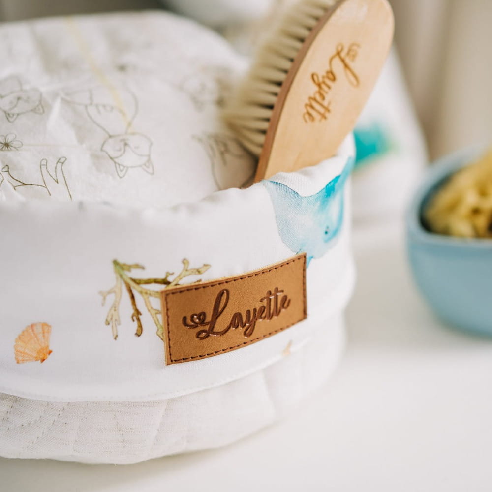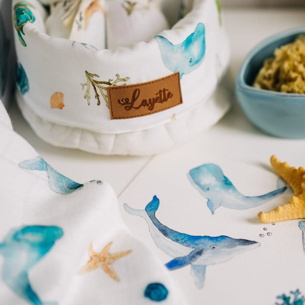Dwustronny pojemnik/koszyk do przechowywania pieluszek, kosmetyków oraz innych akcesoriów dla niemowlaka. Wykonany z tkaniny bambusowej.