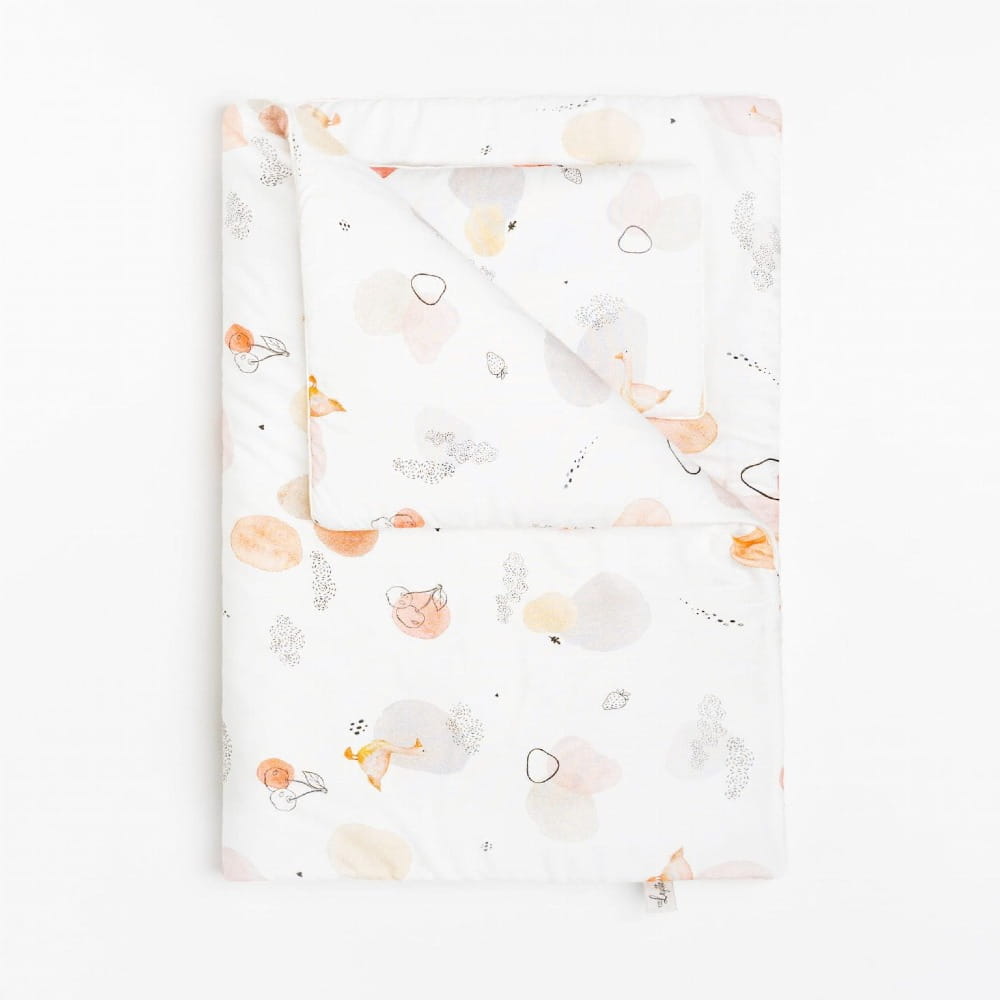 Komplet dwustronnej pościeli bambusowej z płaską poduszką dla niemowlaka z antyalergicznym wypełnieniem. Dedykowania dla dzieci od urodzenia do 2,5 roku.