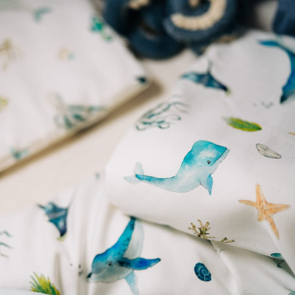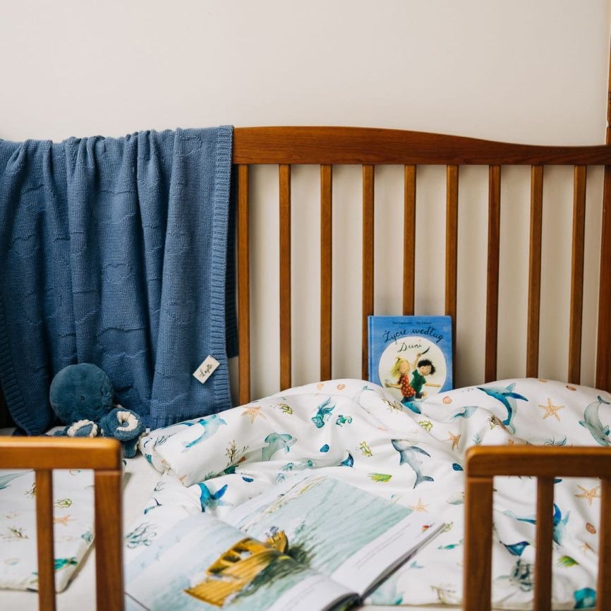 Komplet dwustronnej pościeli bambusowej z płaską poduszką dla niemowlaka z antyalergicznym wypełnieniem. Dedykowania dla dzieci od urodzenia do 2,5 roku.