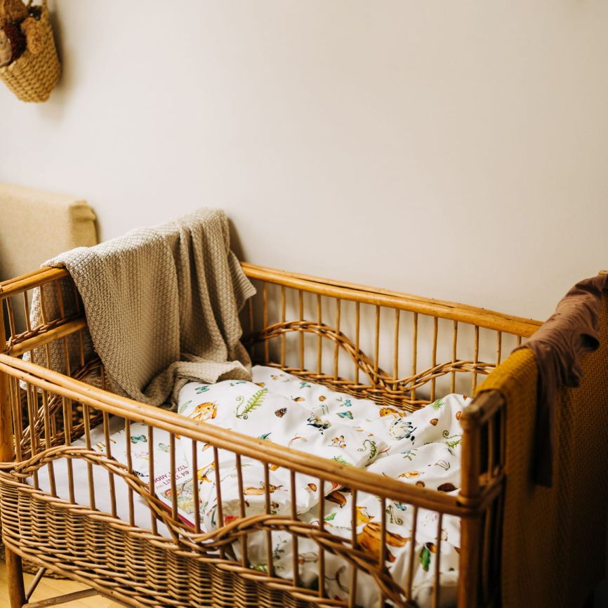Komplet dwustronnej pościeli bambusowej z płaską poduszką dla niemowlaka z antyalergicznym wypełnieniem. Dedykowania dla dzieci od urodzenia do 2,5 roku.