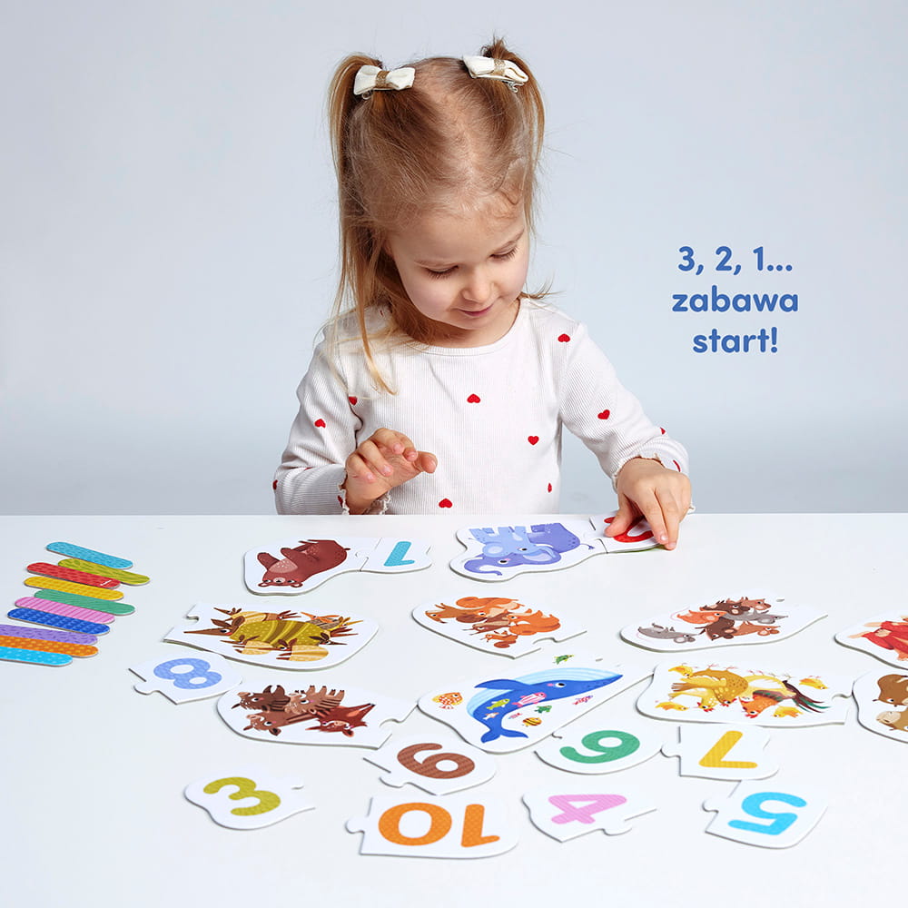 Dziecko dopasowuje puzzle, liczy zwierzątka i łączy je z odpowiednią cyfrą. To świetne wprowadzenie do świata liczb i nauki przez doświadczanie.