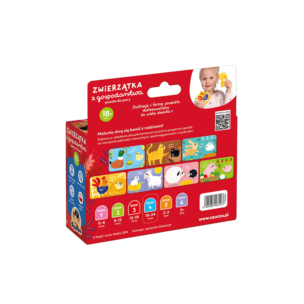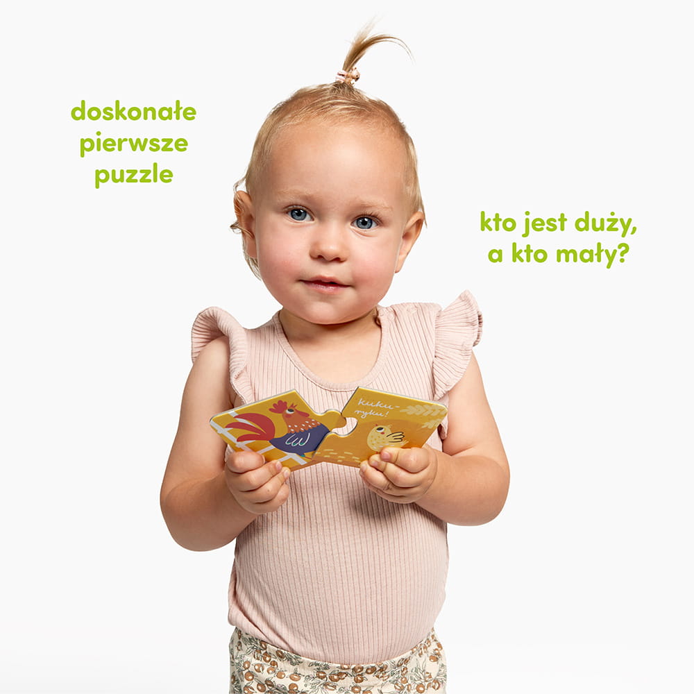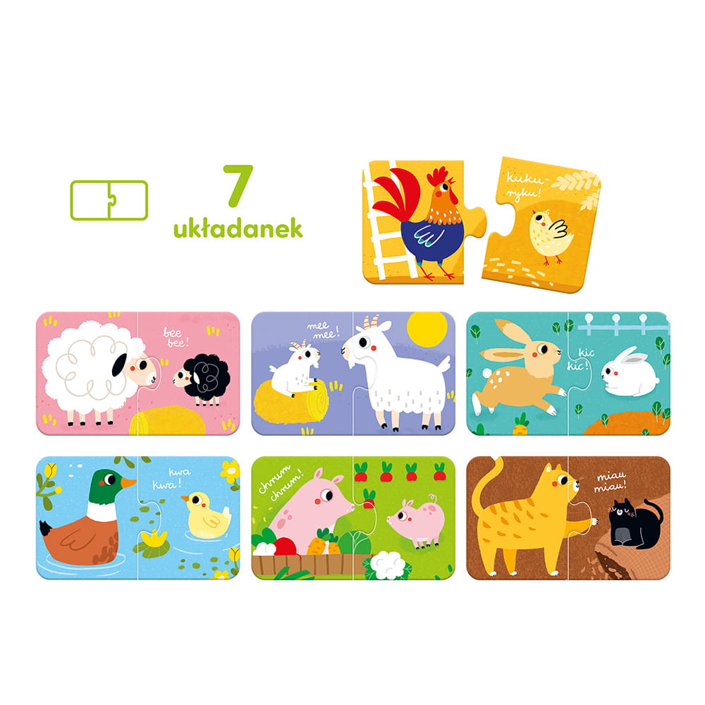 Odkryj radość z nauki przez zabawę z puzzlami "Zwierzątka z gospodarstwa," stworzonymi specjalnie dla dzieci powyżej 18 miesiąca życia. Ten kolorowy, poręczny zestaw edukacyjny zawiera 7 dwuelementowych układanek, które przedstawiają duże i małe zwierzątka wiejskie, zapraszając najmłodszych do pierwszych puzzlowych wyzwań i odkrywania świata natury.