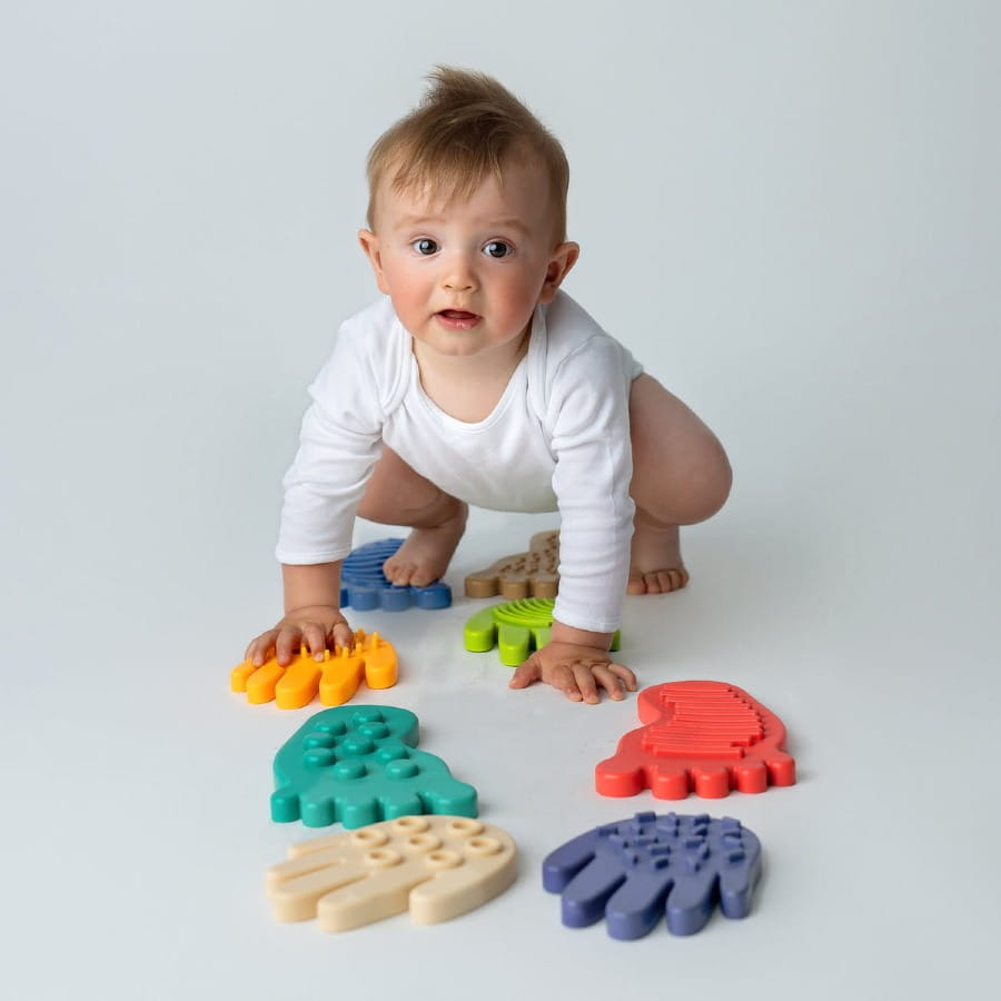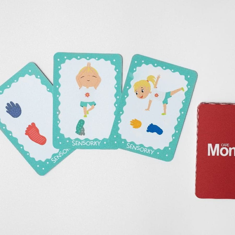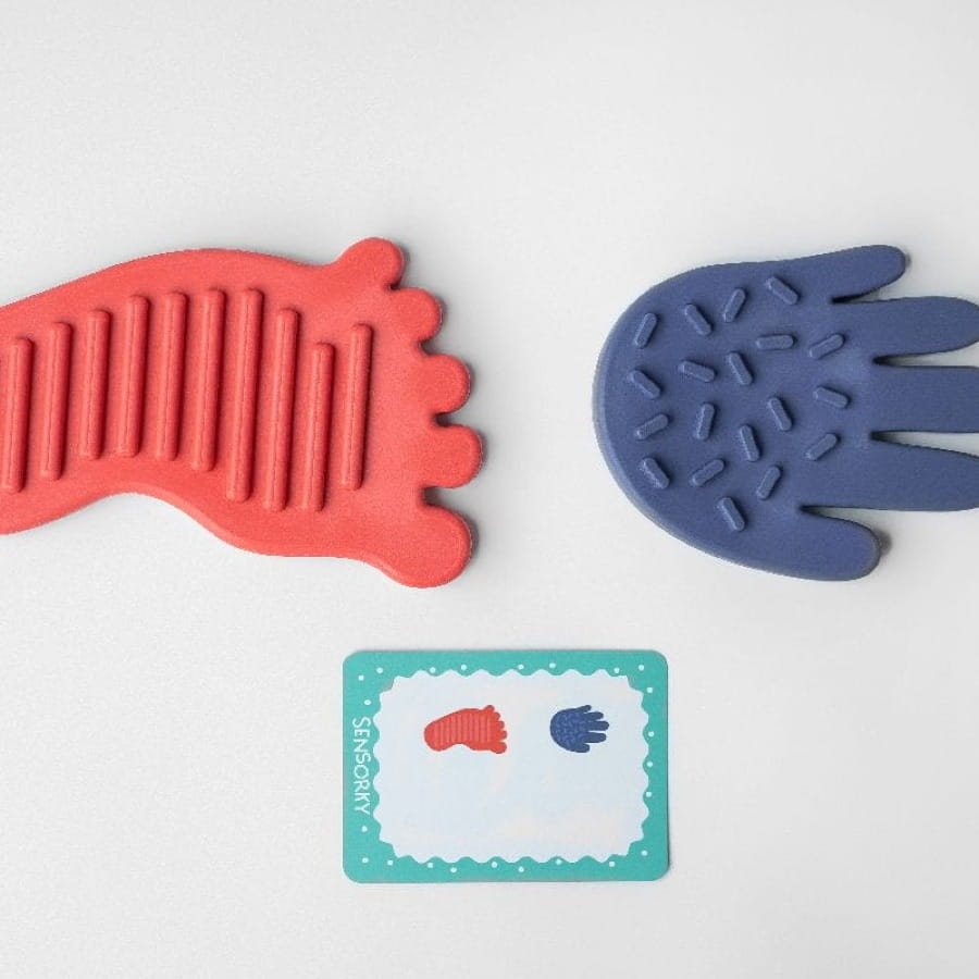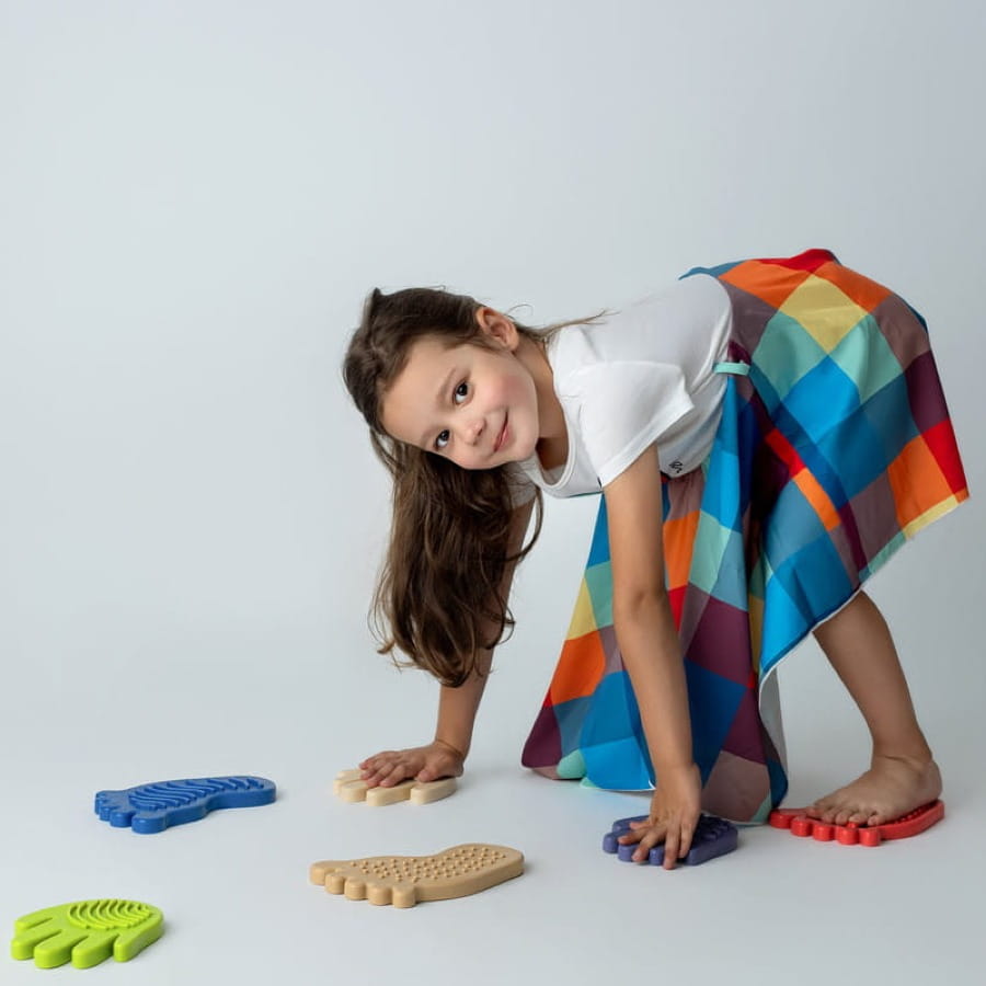 Ścieżka składa się z 8 elementów (4 stopy i 4 dłonie), z których każdy posiada inną strukturę sensoryczną. W zestawie znajdziesz także talię 20 kart ruchowych, które inspirują do różnorodnych ćwiczeń.