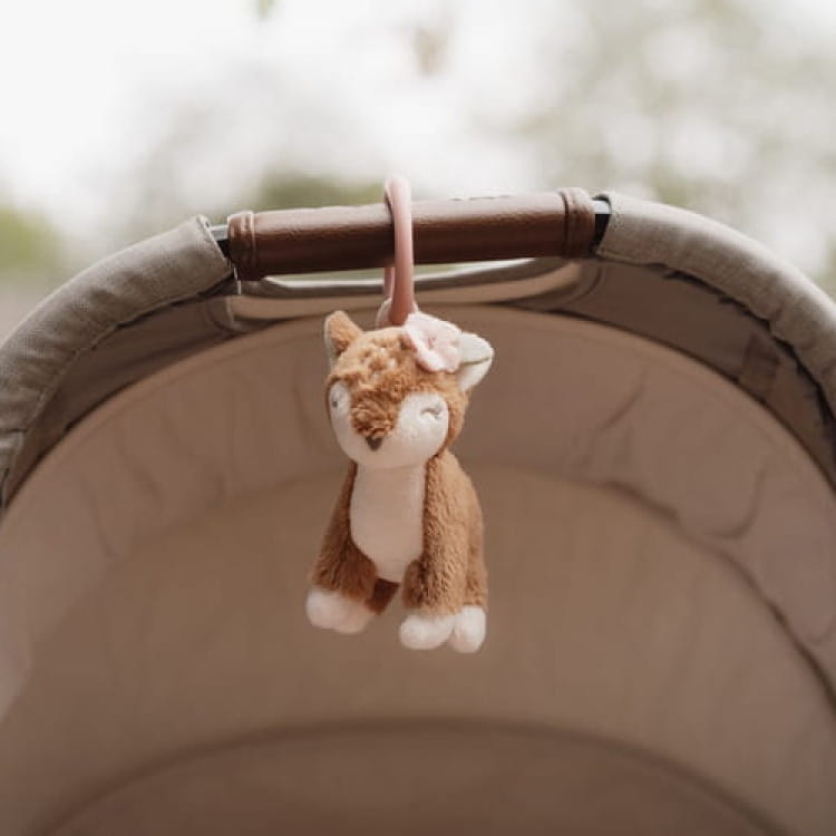 Dzięki praktycznemu pierścieniowi zawieszkę można z łatwością przymocować do fotelika samochodowego, gondoli lub łóżeczka. Mięciutka w dotyku sarenka jest bezpieczna dla dziecka, a jej pastelowe kolory oraz przyjazny wygląd wprowadzają w spokojny, bajkowy klimat ogrodu wróżek.