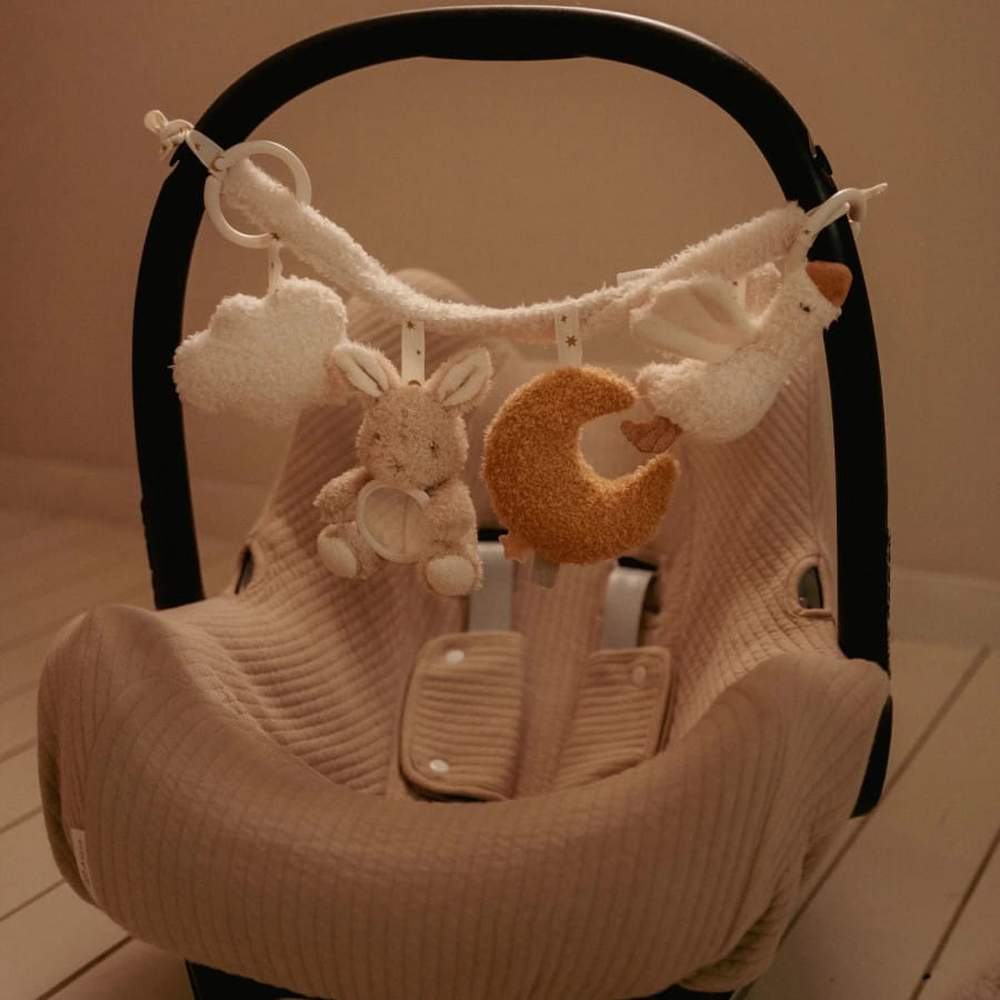 Można ją łatwo przymocować do wózka, gondoli lub fotelika samochodowego, co sprawia, że idealnie sprawdza się w domu i w podróży. Zawieszka Little Dutch wykonana została z miękkich, bezpiecznych materiałów, a jej wypełnienie pochodzi z poliestru z recyklingu. Subtelna kolorystyka w odcieniach beżu i kremu doskonale pasuje do pozostałych produktów z kolekcji Newborn Naturals.