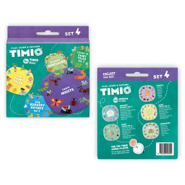 TIMIO Zestaw dysków 4 to najbardziej rozbudowany zestaw w serii, stworzony z myślą o dzieciach, które kochają odkrywać, słuchać i uczyć się poprzez zabawę. W komplecie znajduje się 5 magnetycznych dysków: Rymowanki cz. 3, Bajki cz. 2, Bajki cz. 3, Małe owady oraz Dinozaury. Zestaw ten stanowi doskonałe uzupełnienie odtwarzacza TIMIO, oferując dziecku godziny angażującej nauki w 8 językach.