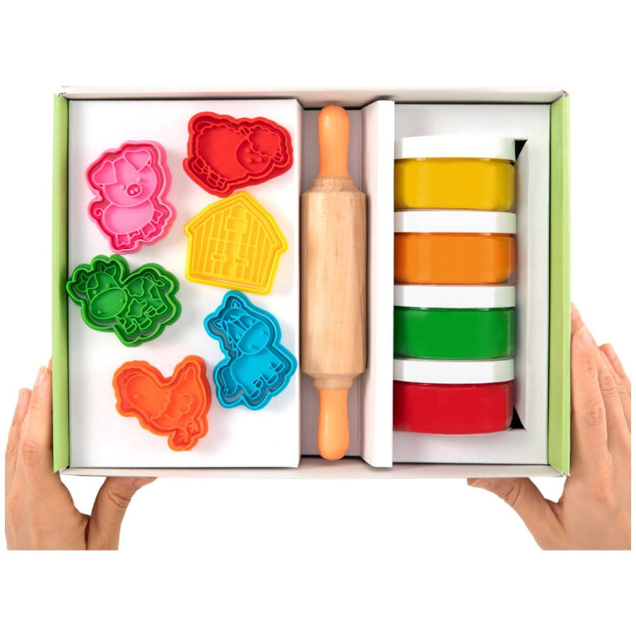 W zestawie znajduje się 12 foremek do wykrawania kształtów i stemplowania, w tym formy przedstawiające krowę, konia, kurę, owcę, świnkę oraz kurnik. Maluch może rozwałkować ciastolinę za pomocą drewnianego wałka, wykroić ulubione zwierzątko, a następnie odcisnąć je stempelkiem.